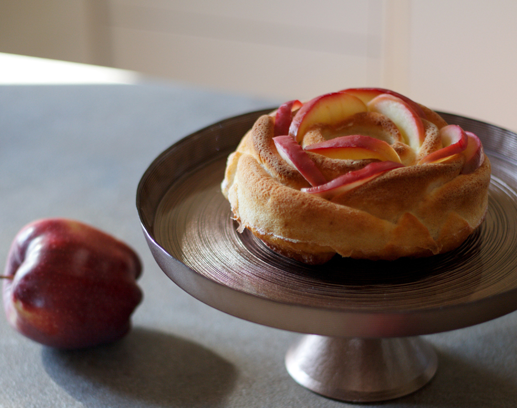 - Disponi il composto in una teglia imburrata e infarinata, e decora la superficie con gli spicchi di mela rimasti.